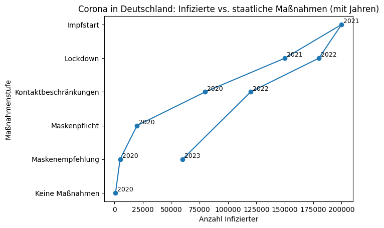 Zu Beginn der Pandemie im Jahr 2020 wurden bereits bei relativ niedrigen Infiziertenzahlen erste Maßnahmen wie Maskenempfehlungen und Maskenpflicht eingeführt. Mit steigenden Infektionszahlen folgten Kontaktbeschränkungen und Lockdowns. Auffällig ist, dass in den späteren Jahren 2022 und 2023 ähnliche oder höhere Infiziertenzahlen mit weniger strengen Maßnahmen einhergehen als in den Jahren zuvor. Dies deutet auf eine veränderte politische Bewertung des Infektionsgeschehens hin, etwa durch Impfungen, veränderte Risikowahrnehmung oder gesellschaftliche Ermüdung.