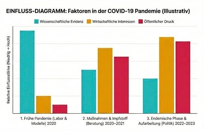 Das Diagramm zeigt, den relativen Einfluss dreier Faktoren auf politische Entscheidungen während der COVID 19 Pandemie in Deutschland illustrativ darstellt. Verglichen werden wissenschaftliche Evidenz, wirtschaftliche Interessen und öffentlicher Druck über drei Pandemiephasen hinweg.